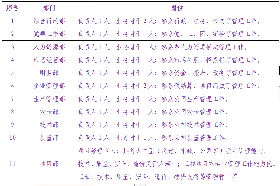 (三)部門負(fù)責(zé)人及項(xiàng)目經(jīng)理應(yīng)具備5年以上相關(guān)工作經(jīng)歷;部門業(yè)務(wù)骨干及項(xiàng)目部相關(guān)負(fù)責(zé)人應(yīng)具備3年以上相關(guān)工作經(jīng)歷;應(yīng)屆畢業(yè)生不限;